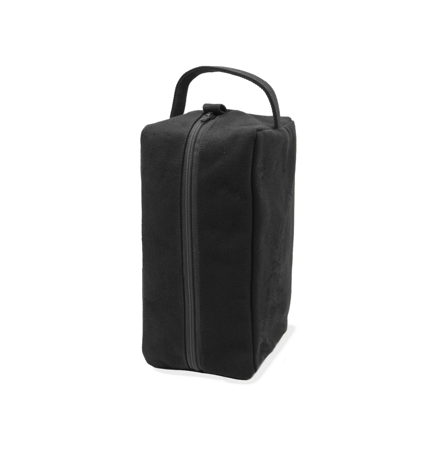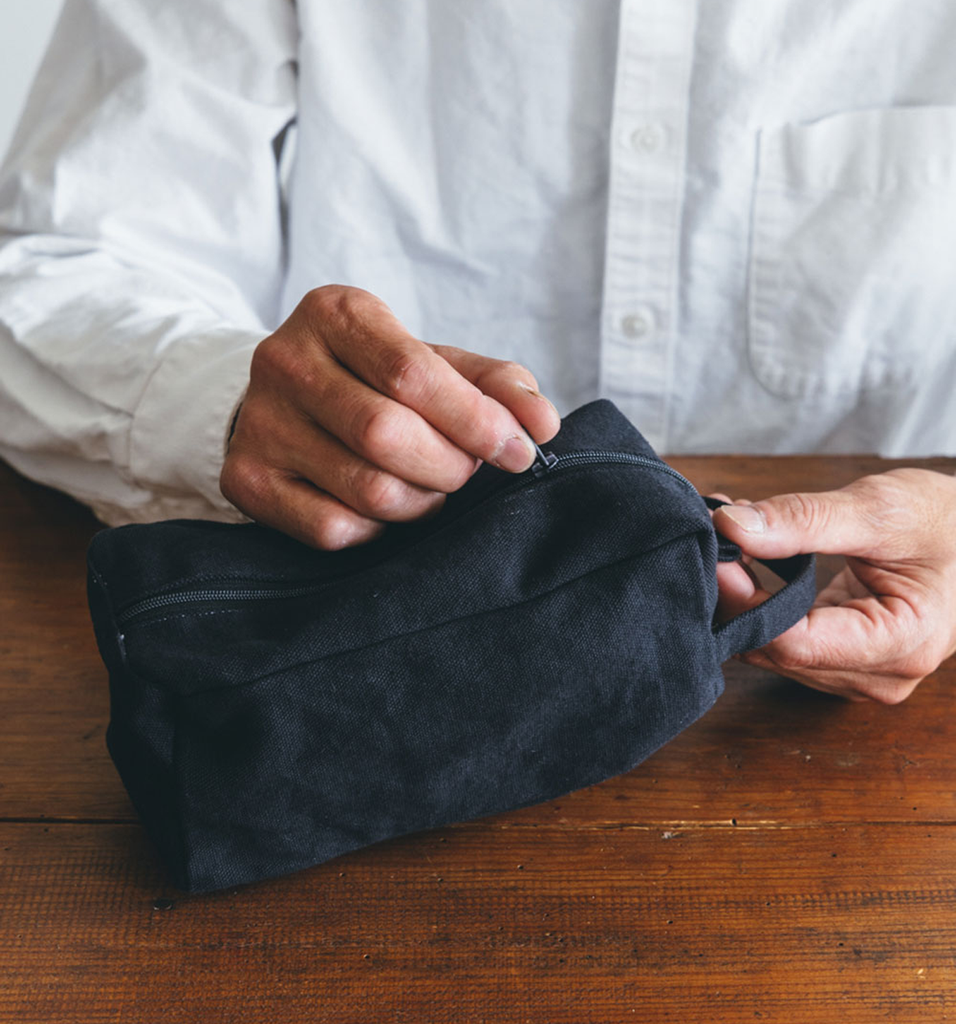 A cube-shaped pouch made from canvas with ample storage capacity. It features a loop on the outside, making it convenient to pick out from your bag and carry around.