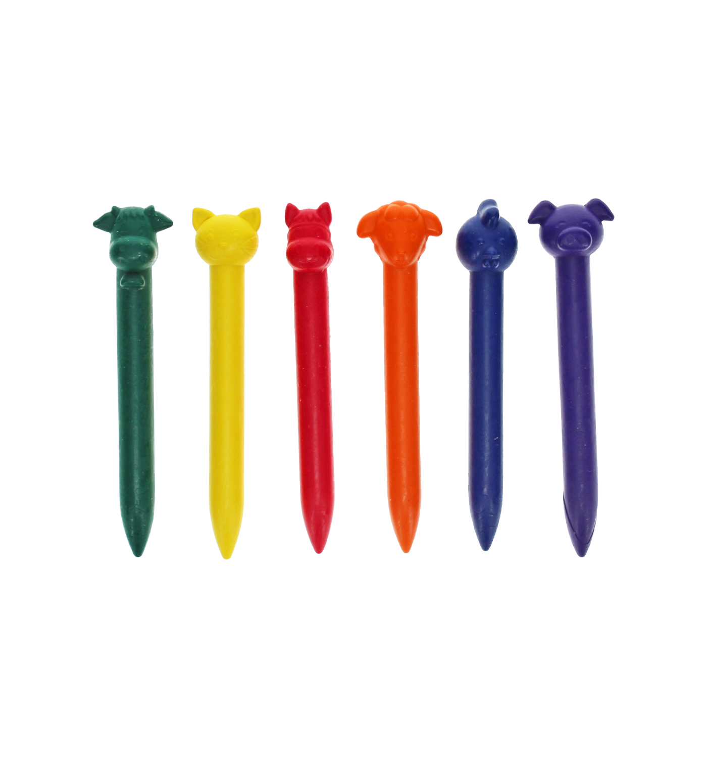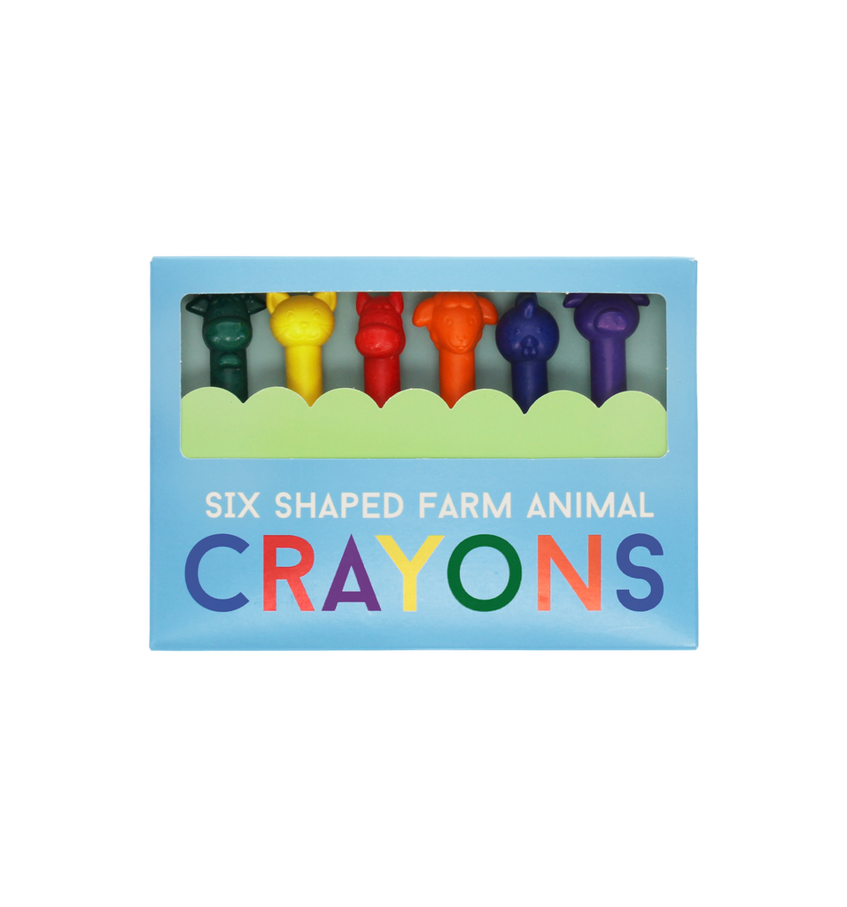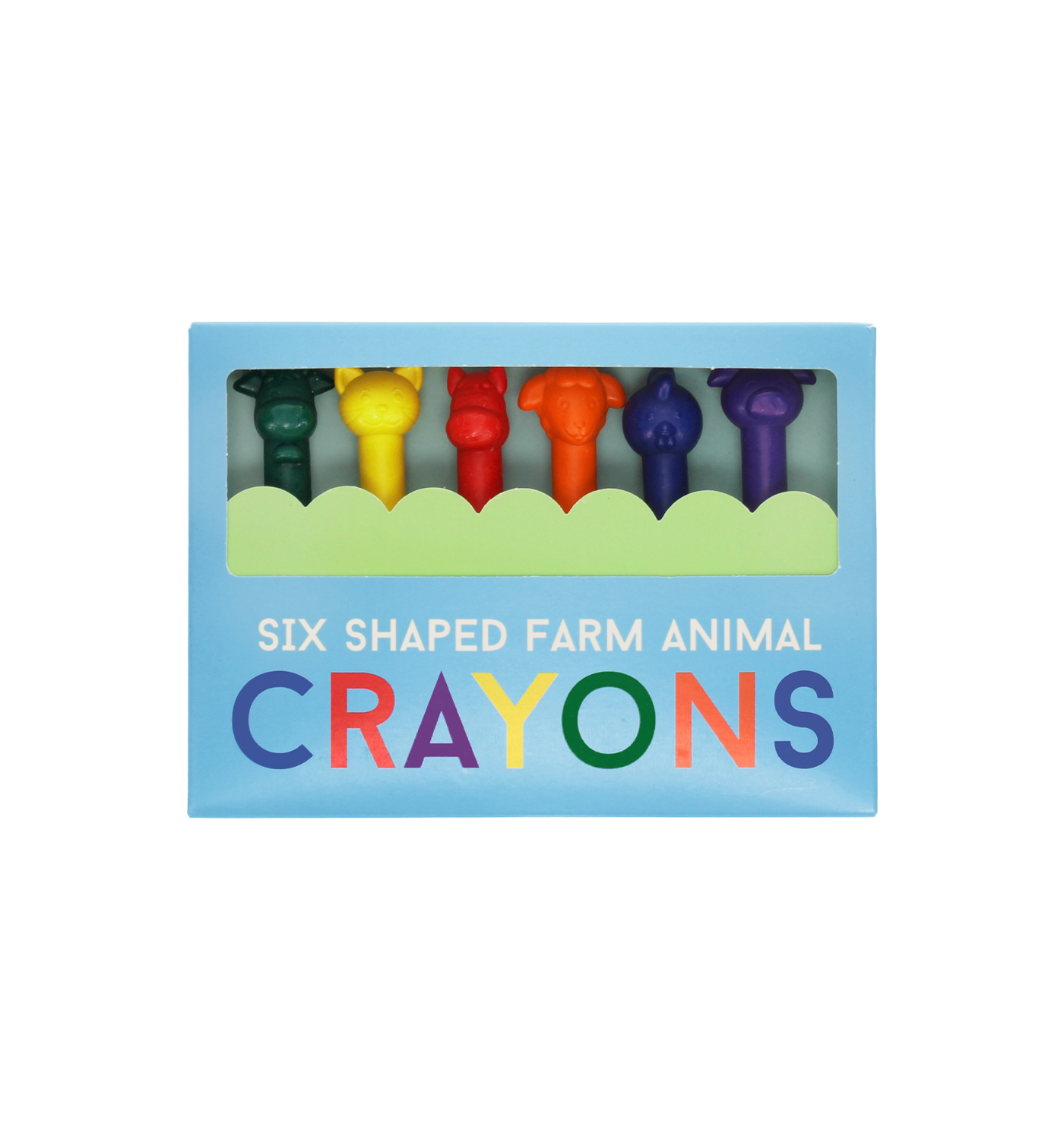 Set of six crayons, each in a vivid colour and topped with a different farm animal head. A quirky and fun way to encourage little ones to start colouring.