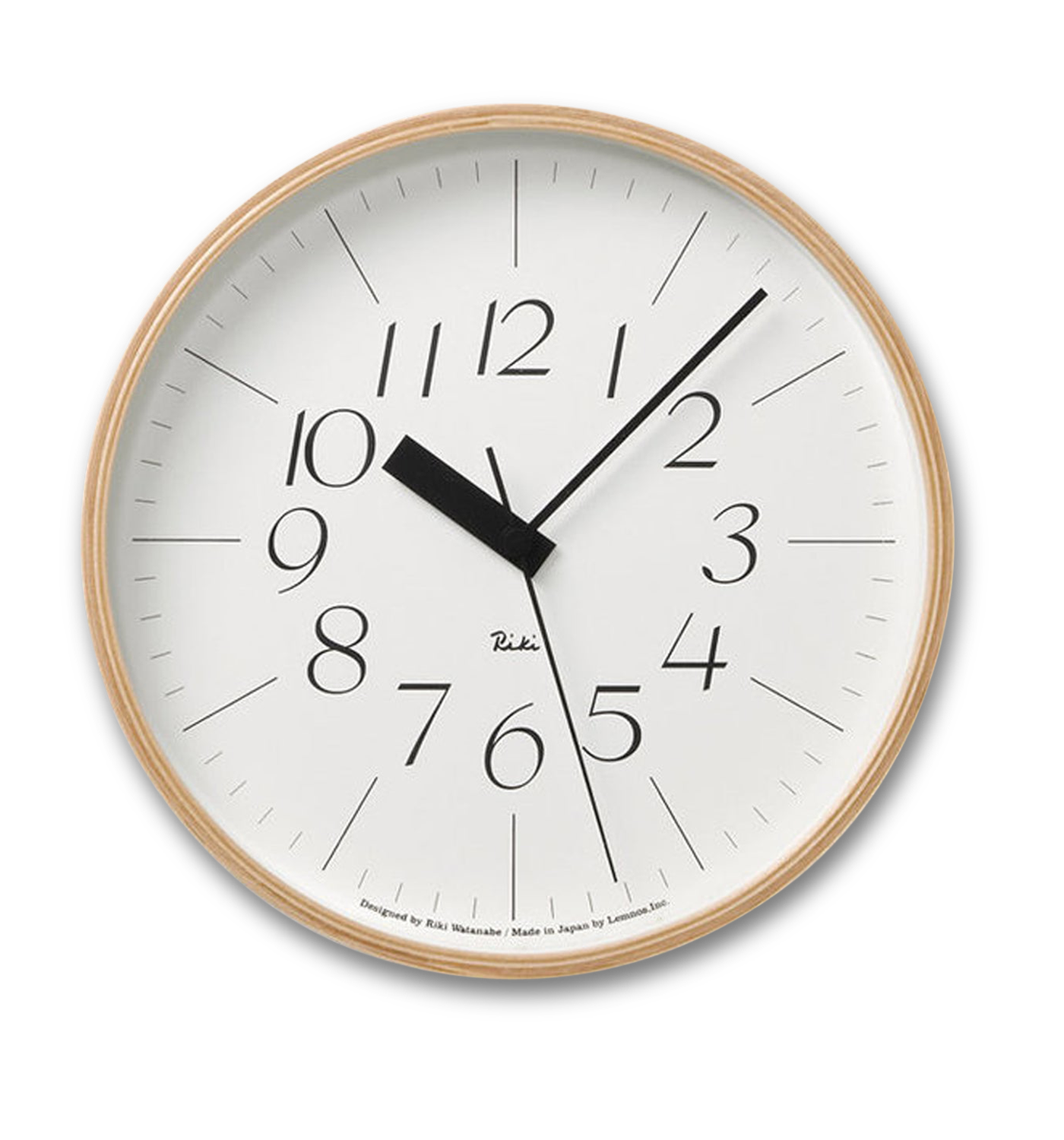 The RIKI wall clock is a beautifully designed clock by Japanese designer Riki Watanabe. The circular plywood case, white dial, and black rectangular tips are elegantly simple, while the large numbers keep the design fun and contemporary. The simple form of the clock and its silent ‘sweep movement’ make this a true design classic.