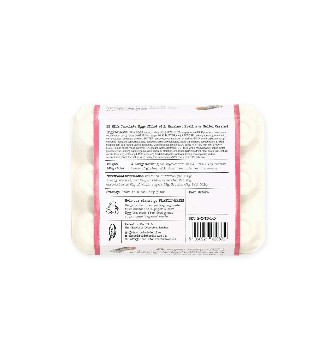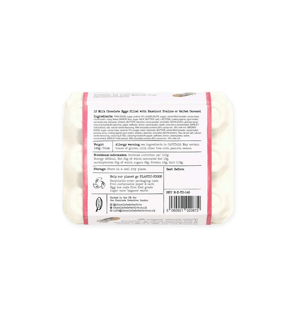 Twelve delicious dark milk chocolate eggs, some filled with yummy hazelnut praline, and others a decadent salted caramel ganache.