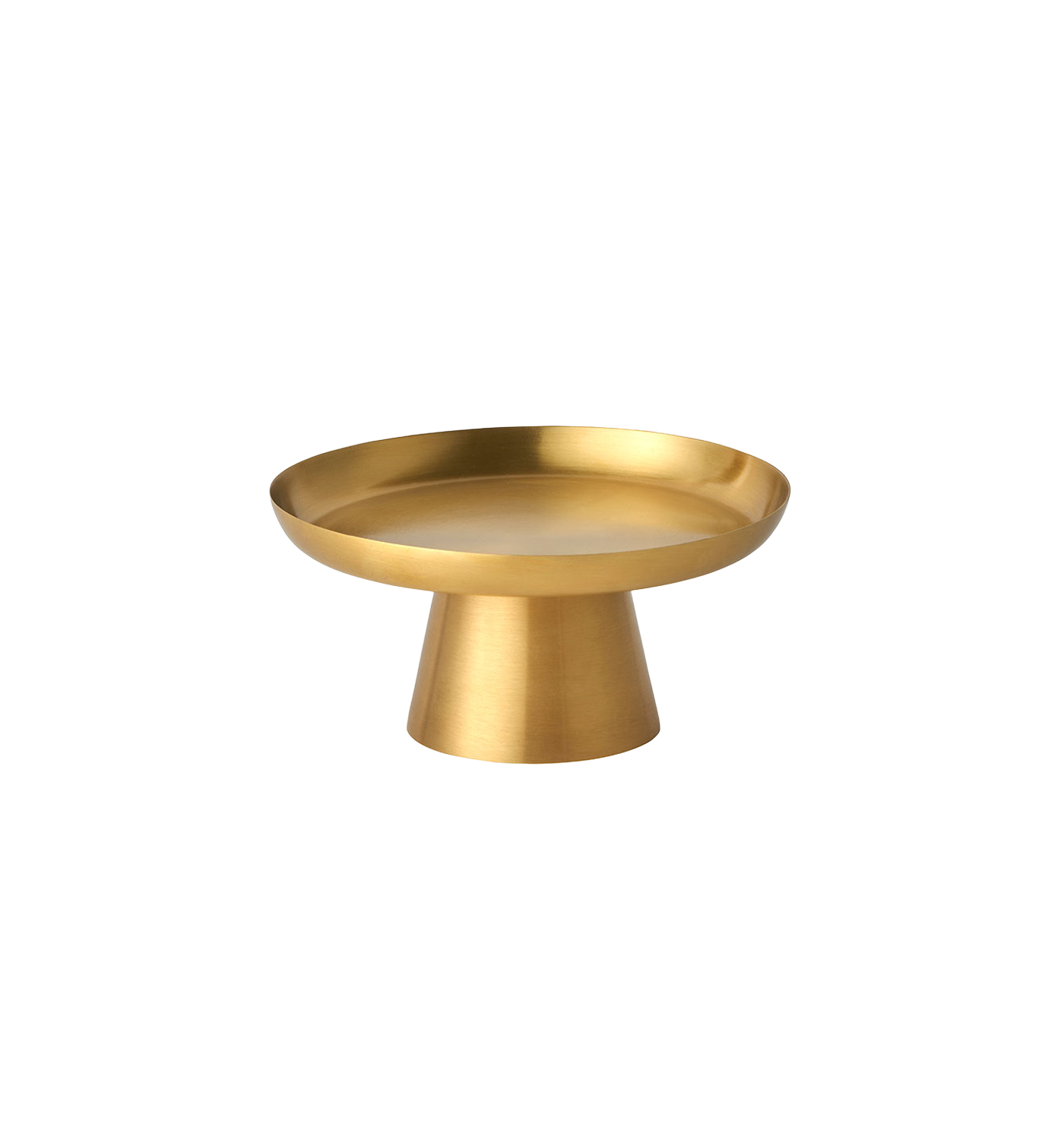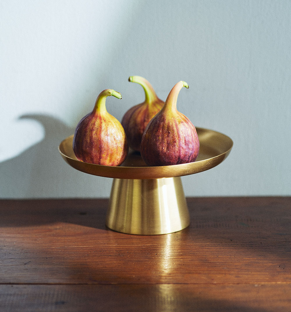 Hand-made cake stand of warm, antiqued brass. Useful for serving treats, collecting loose ends, and displaying candles, to name a few.
