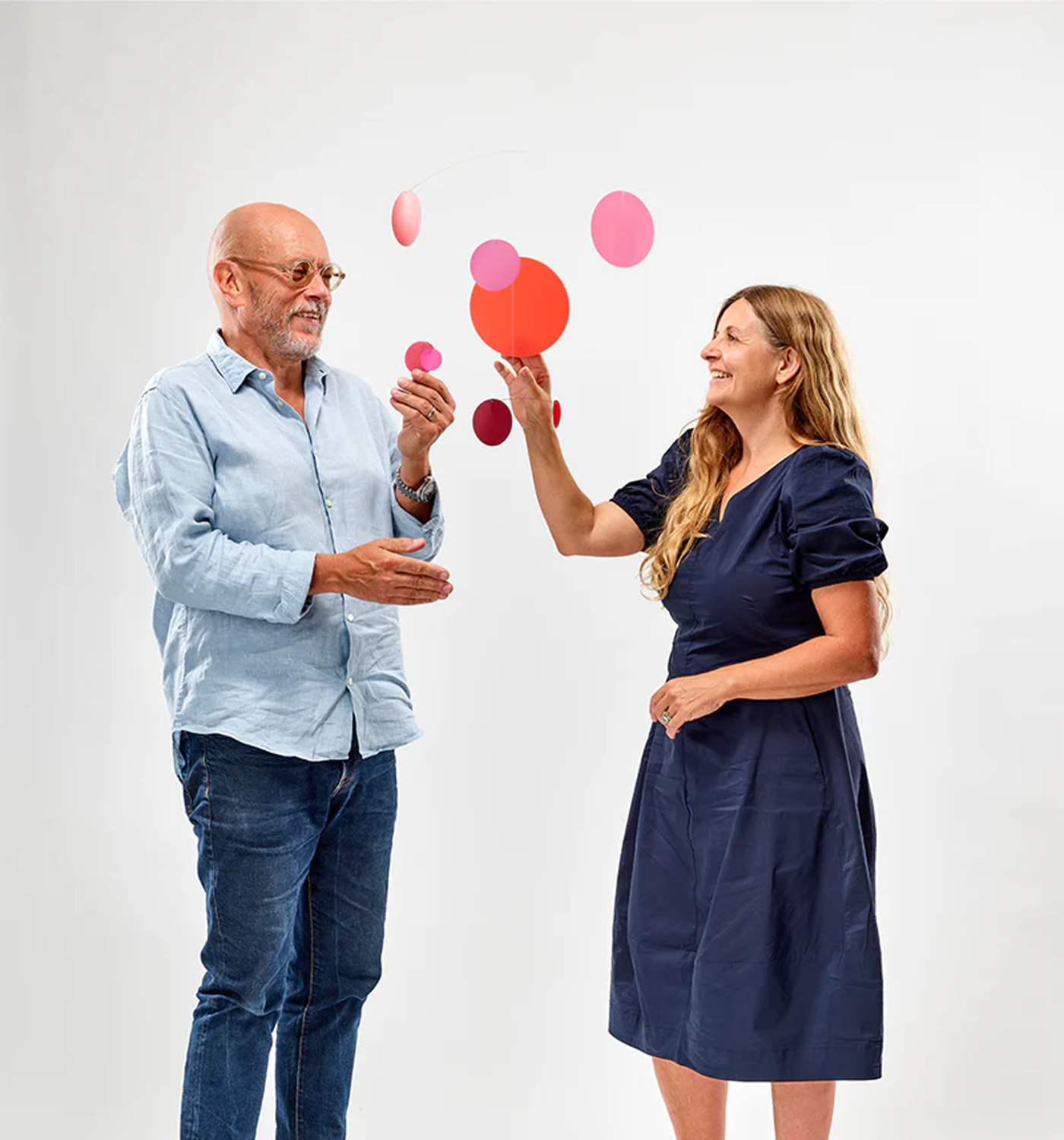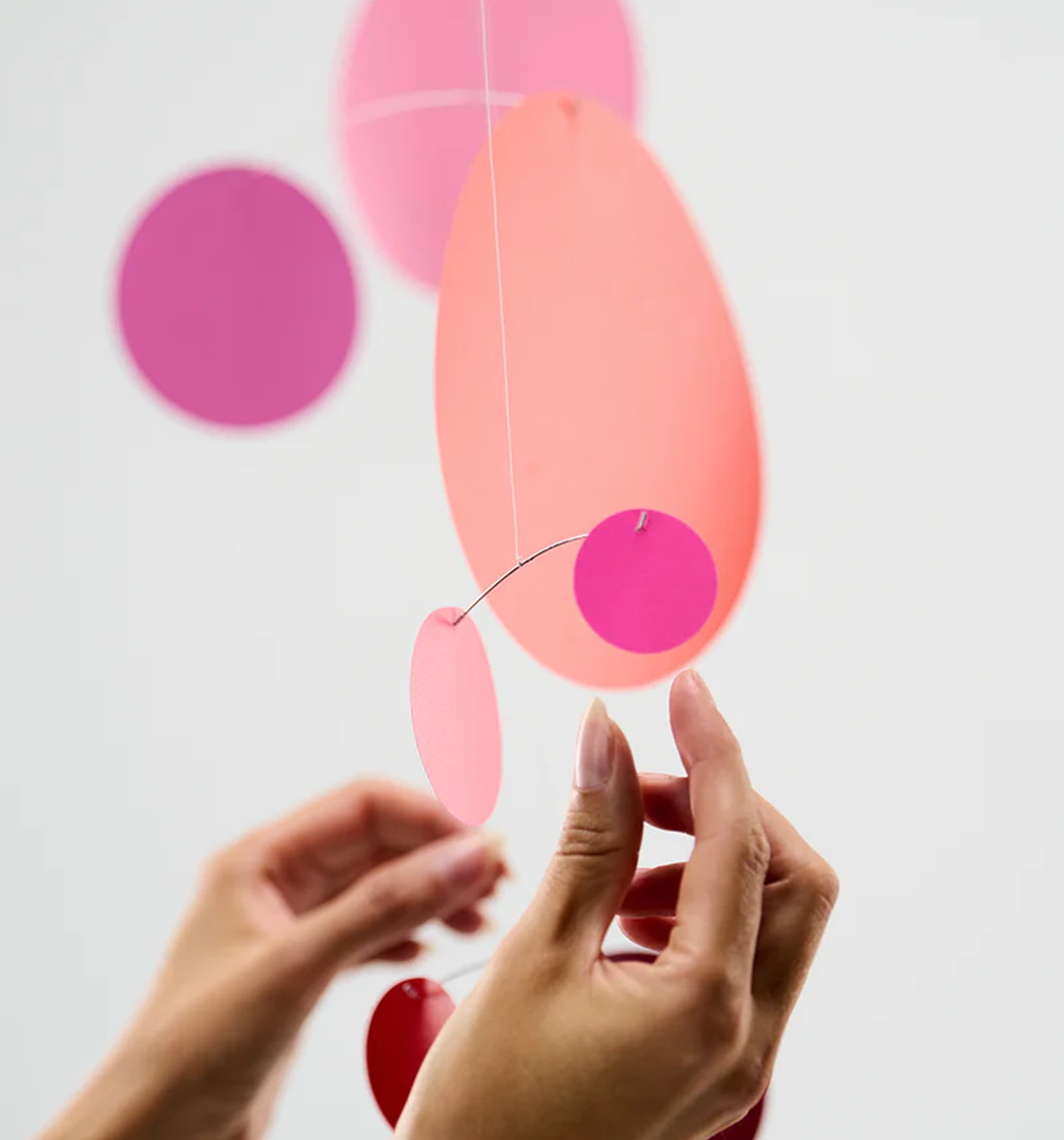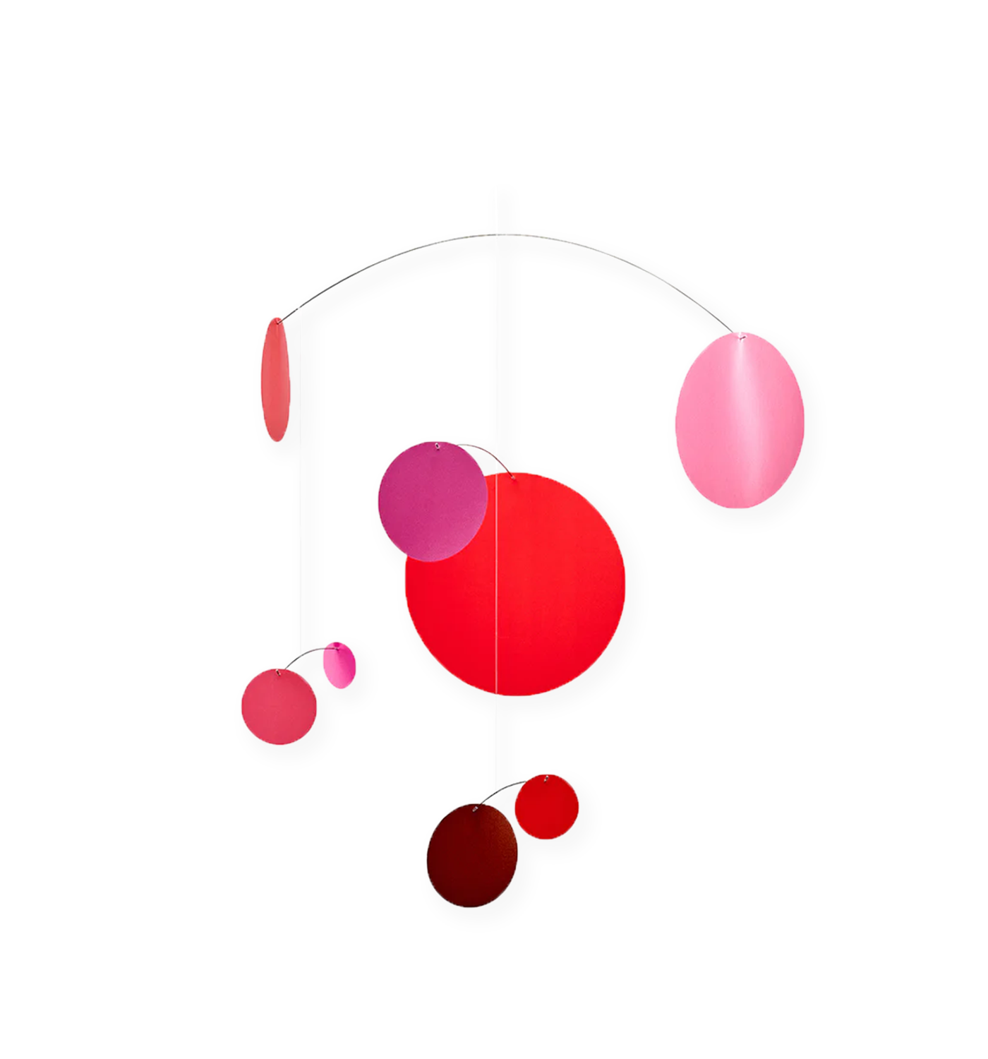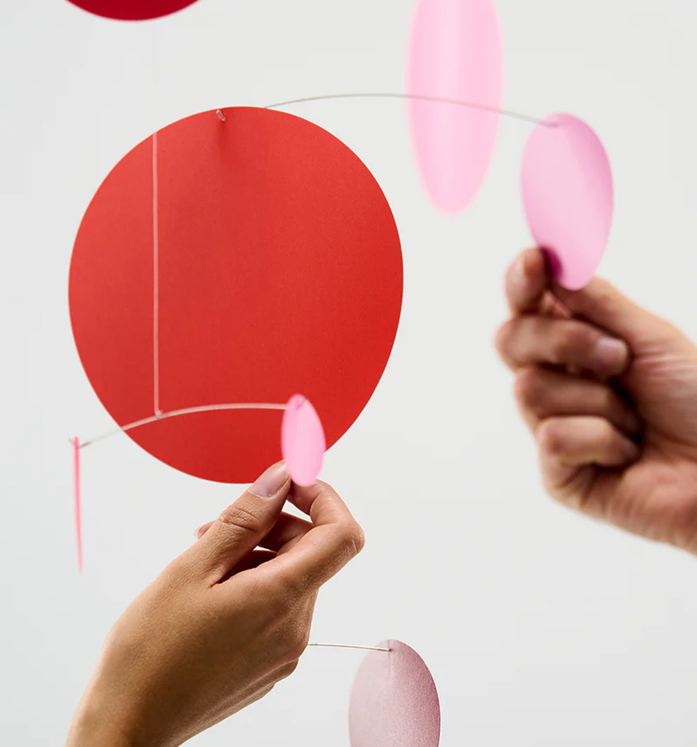 Designed by Rose & Rose Design in 2025, Confetti Blush is a lightweight construction of circles in a playful palette in shades of red. A kinetic sculpture that moves with the slightest breeze. Transparent tracing paper mounted directly on thin steel rods creates a vibrant and light expression.