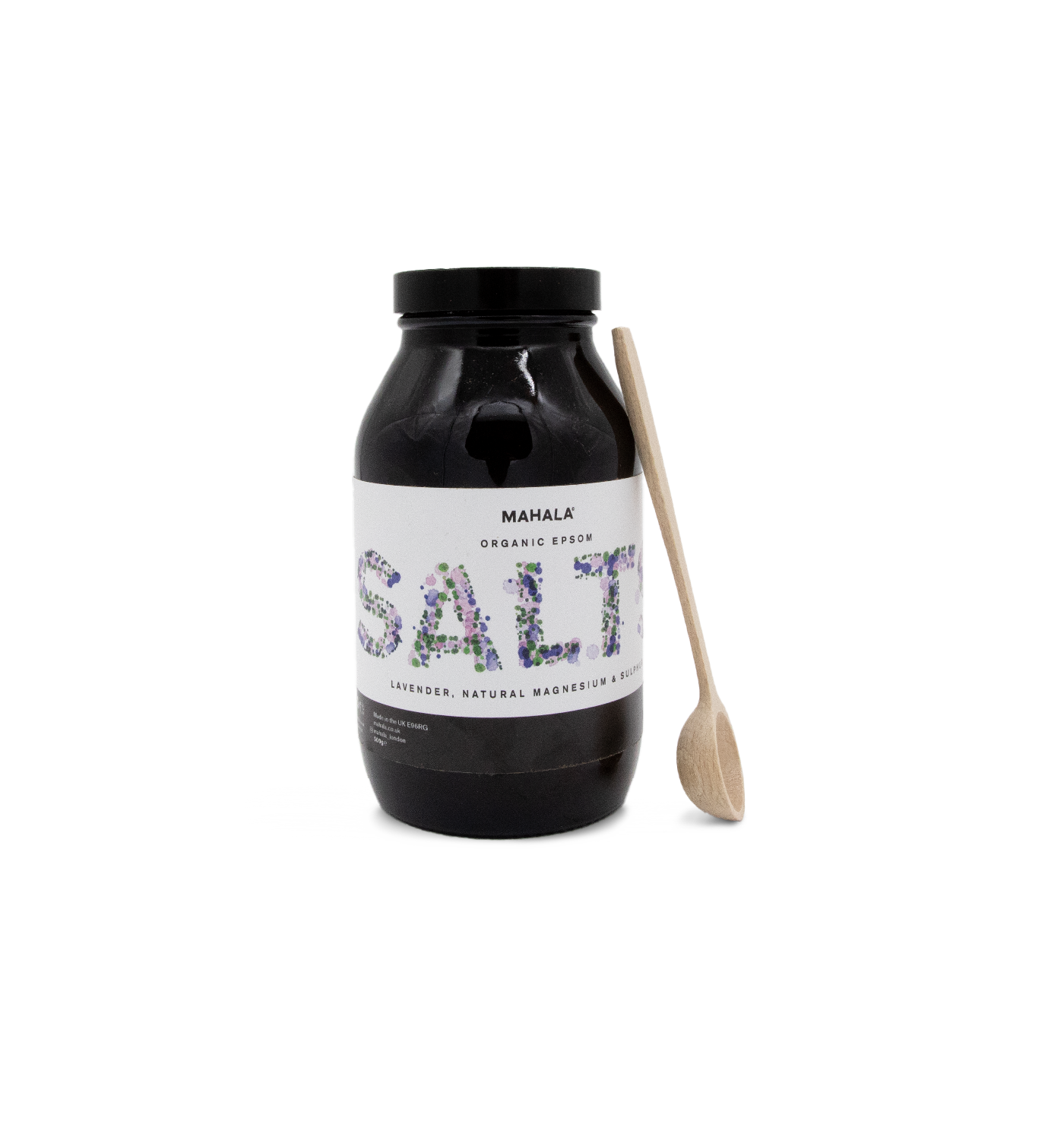 Epsom bath salts with additional dry lavender blossom. These salts help relieve stress by promoting the production of serotonin, which in turn promotes calmness, reduces anxiety, and encourages restful sleep. They can also help reduce inflammation, pain, and muscle tension, while improving circulation.