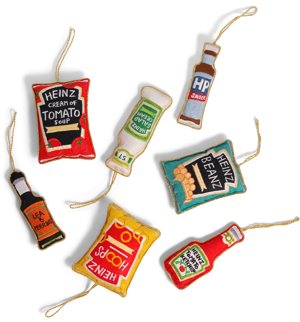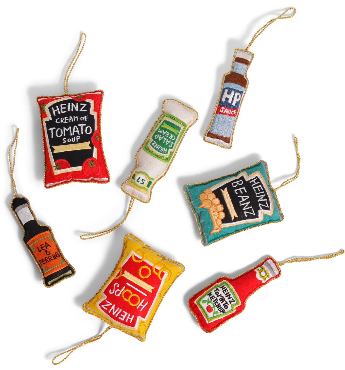 Stitched with a wink to the nation’s favourite food cupboard staples, these embroidered decorations are handmade in India by skilled artisans. Part of an official collaboration with Heinz, each piece captures the charm of an icon — in thread, not glass.