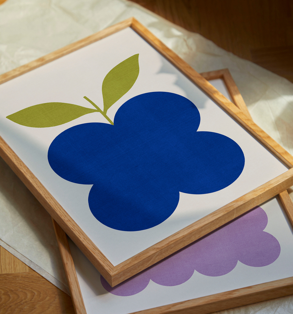 A bold graphic print by London-based illustrator Juliette van Rhyn. Thr vivid colours are fun and eyecatching, whilst the neautral background and organic textures keep the peice grounded, making it a perfect addition for both maximalist and minimalist homes alike.