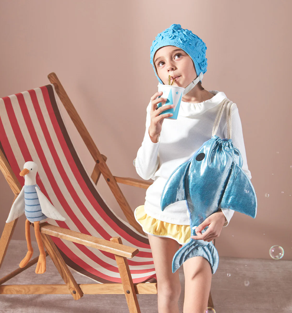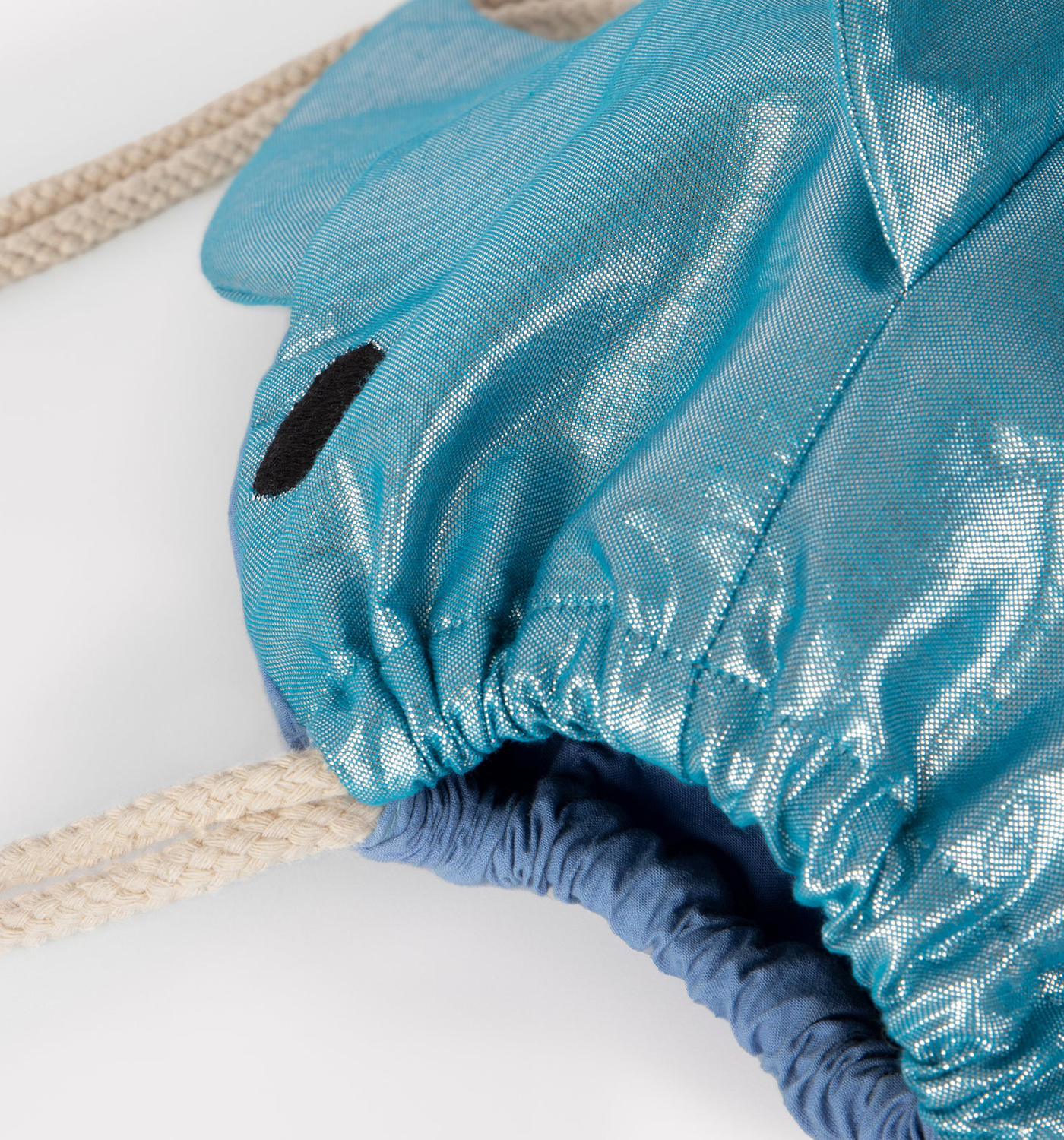 Kids will love to transport their favourite items in this stunning shark backpack. It's crafted from shiny lamé, with a fabulous fin detail, quilted tail and cotton lining.