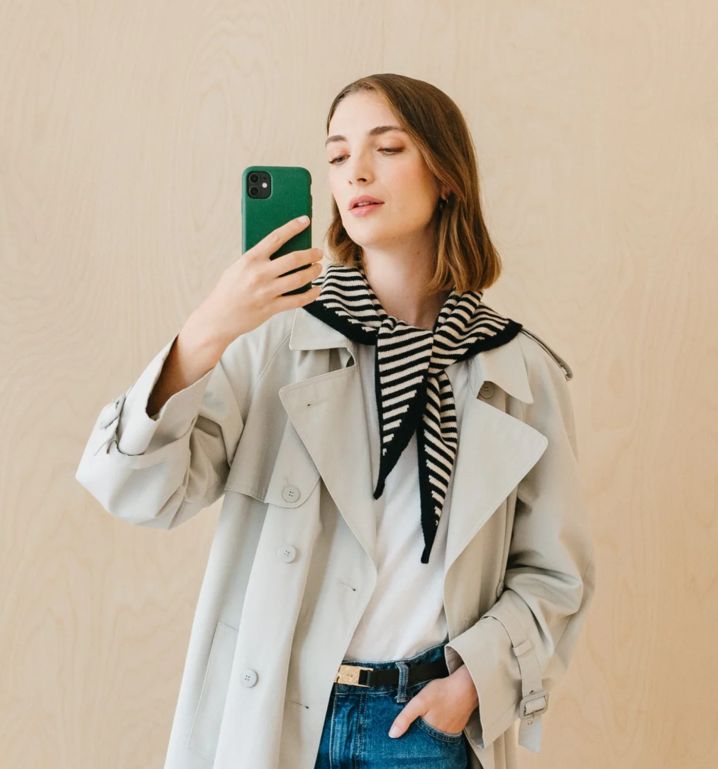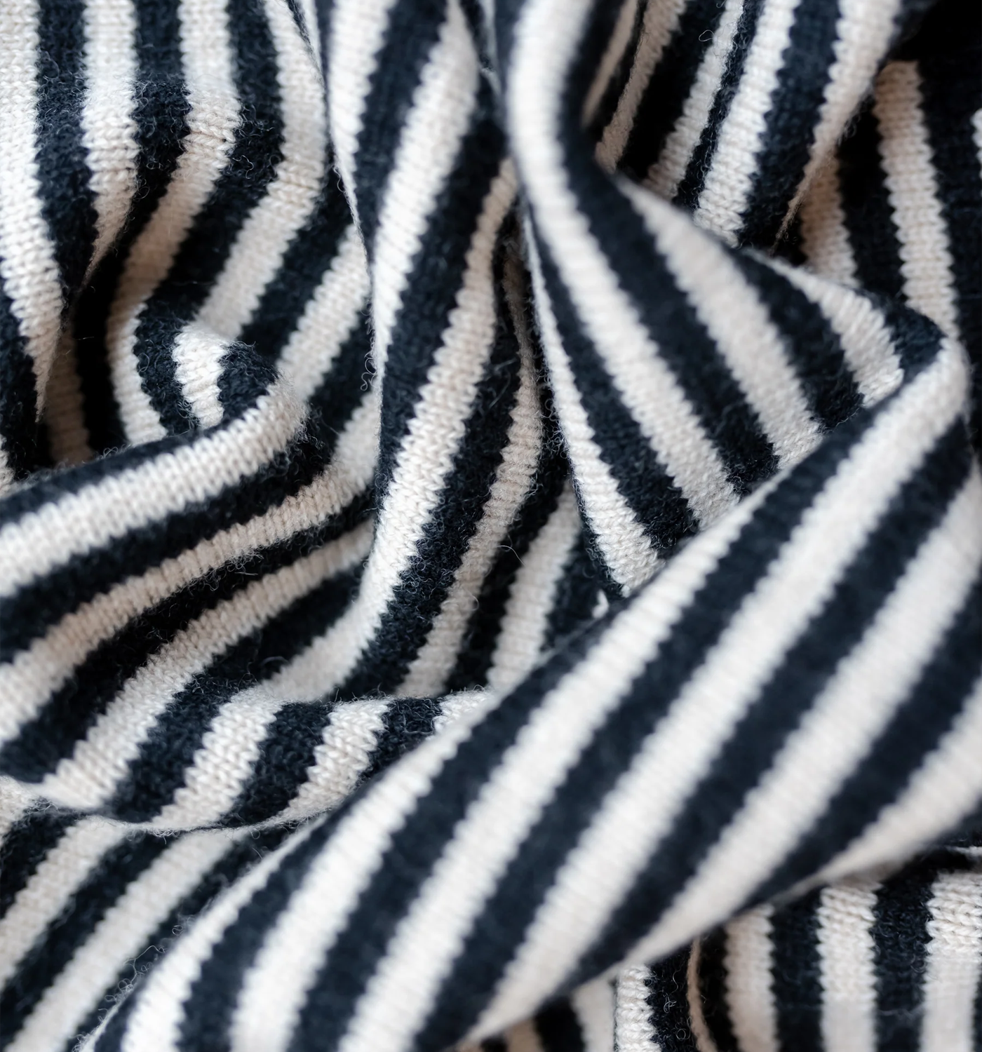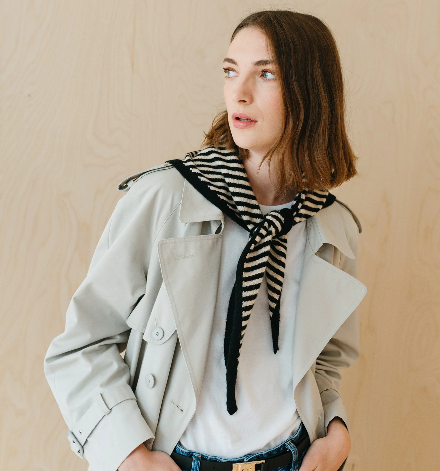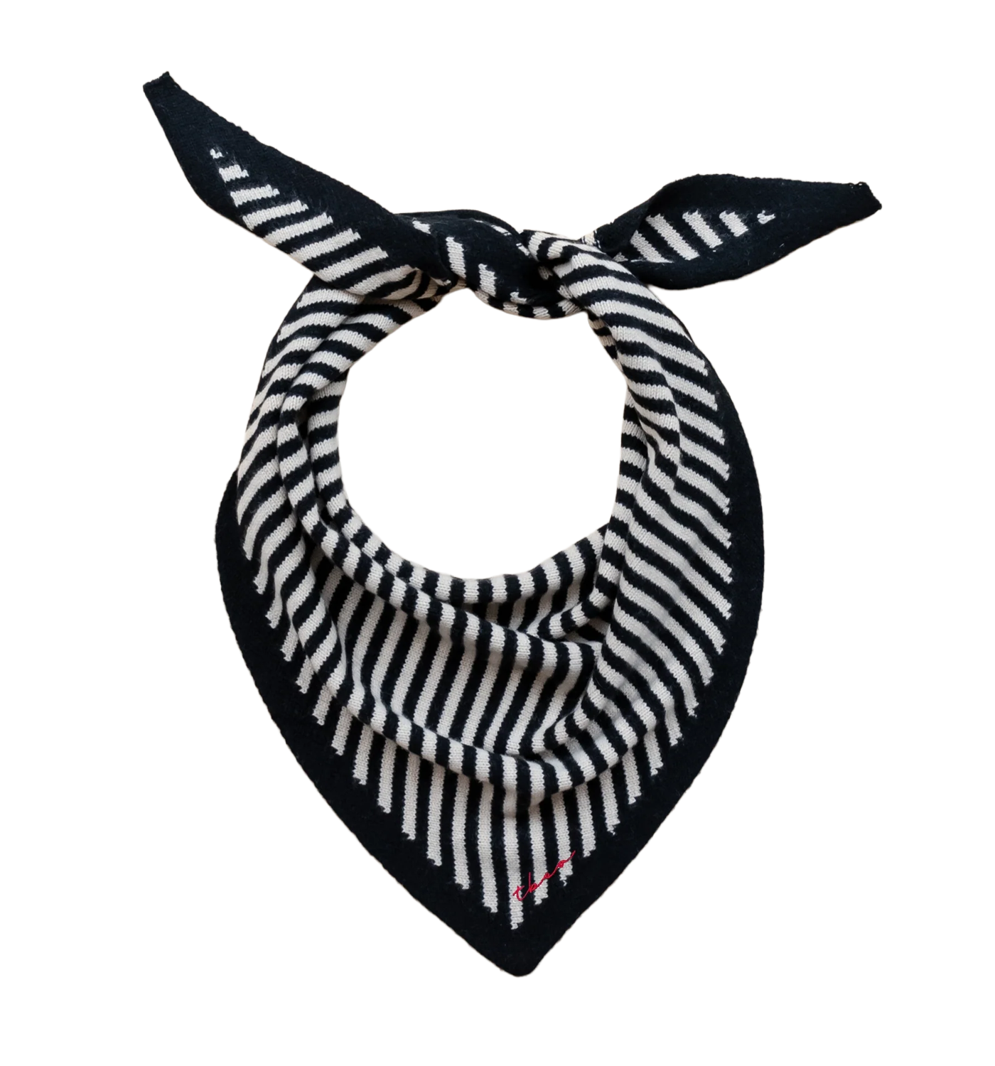 Easily add interest and elevate your outfit with this two-toned triangle scarf that features a classic black and cream stripe along with an embroidered red TBCo logo. It's knitted from soft and warm merino wool, and can be tied in multiple ways for endless styling options.