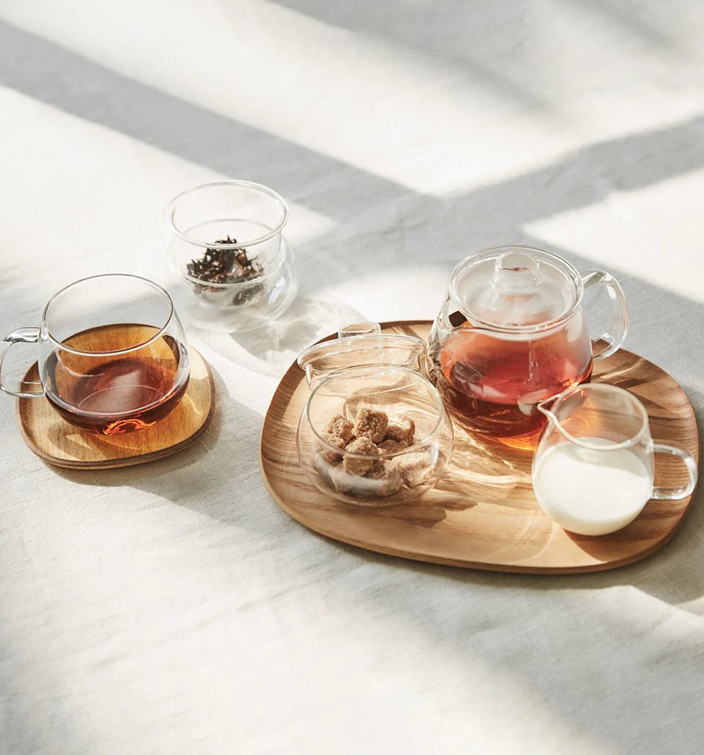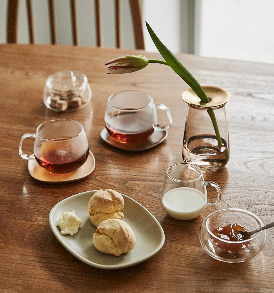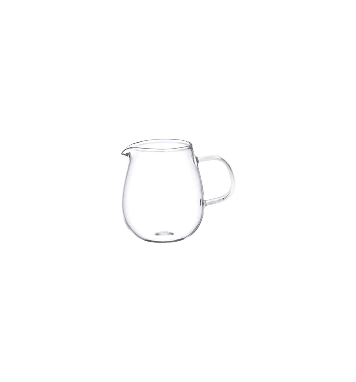 A small milk pitcher to sit harmoniously with the Unitea collection. While made of glass, the large, arched design of the handle allows you to grip firmly and comfortably.