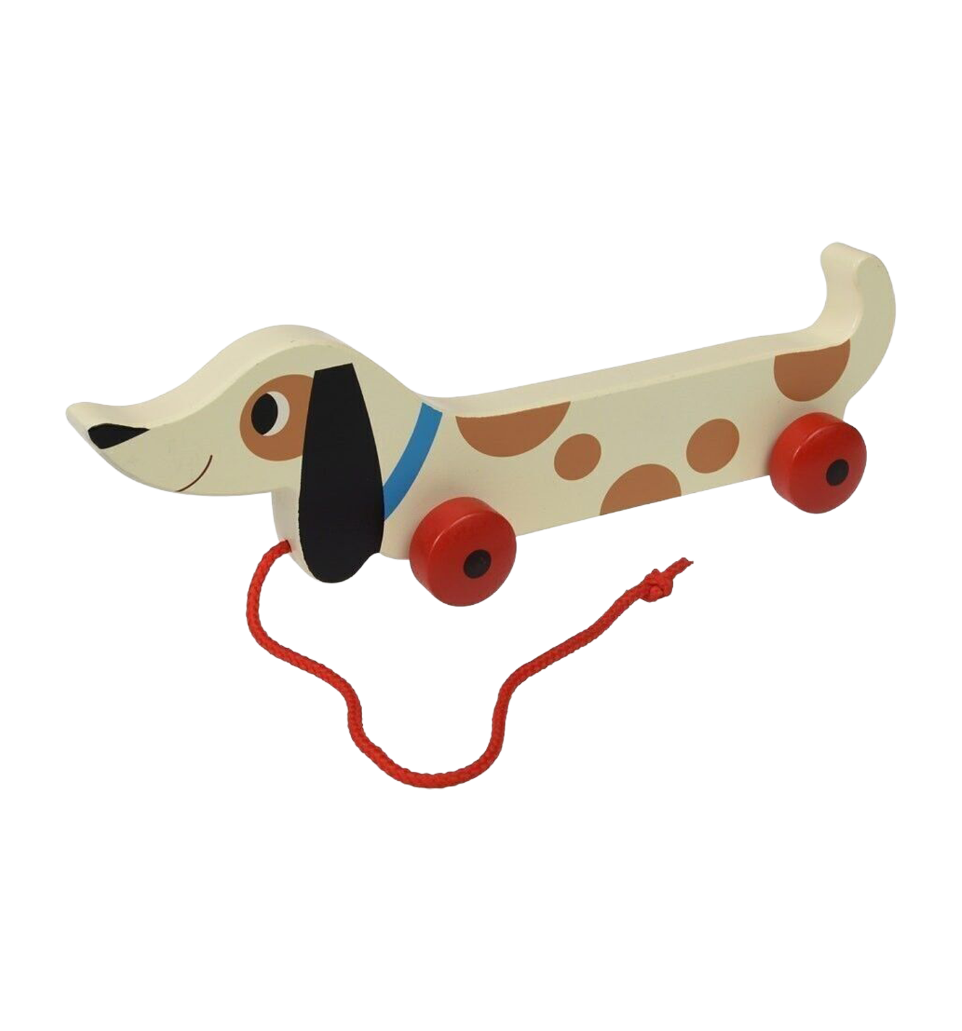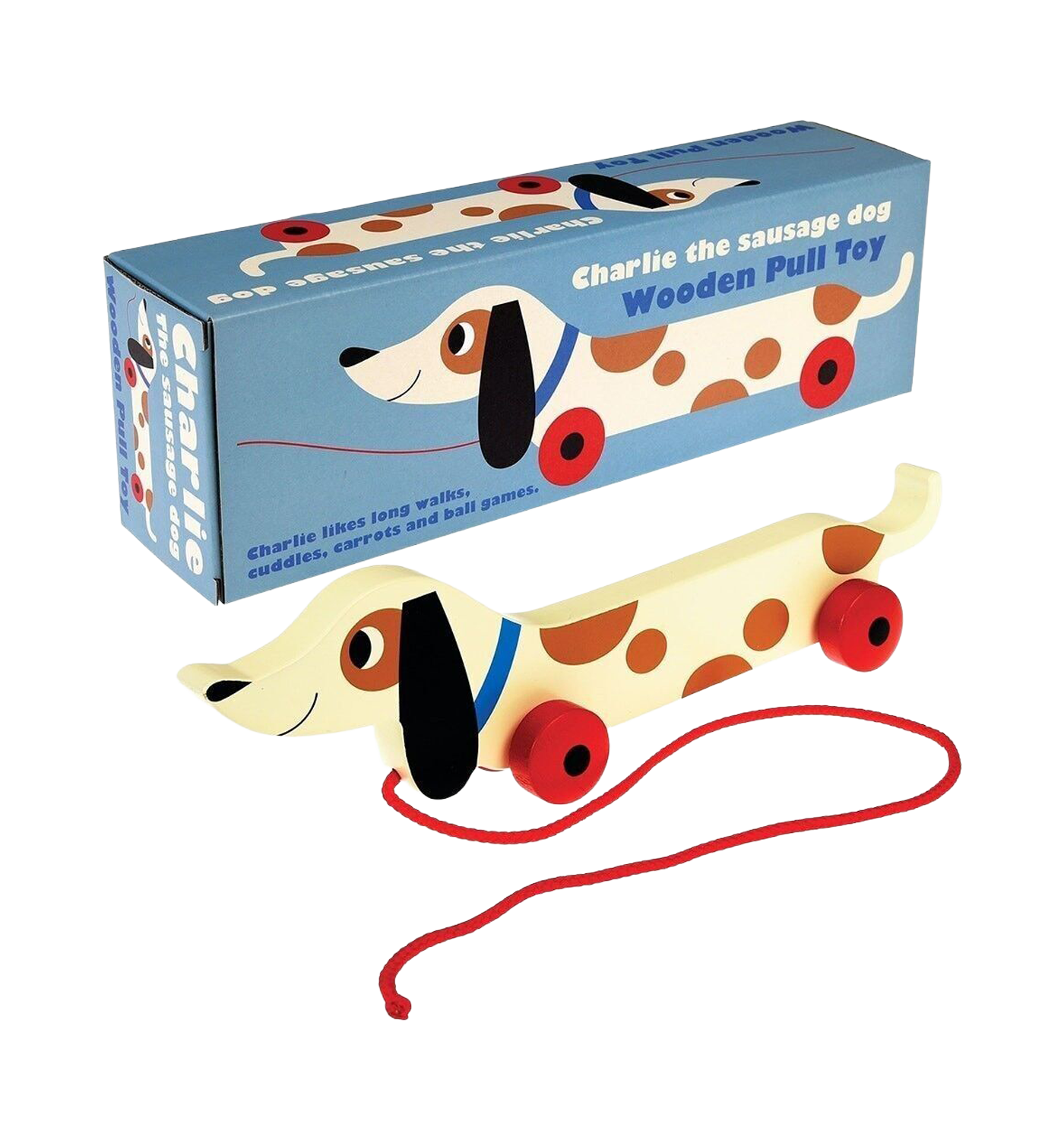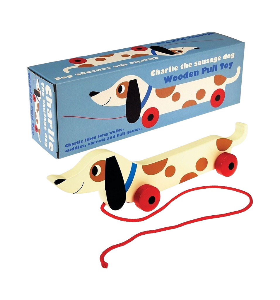A charming wooden pull-along toy in the shape of a cute sausage dog named Charlie.