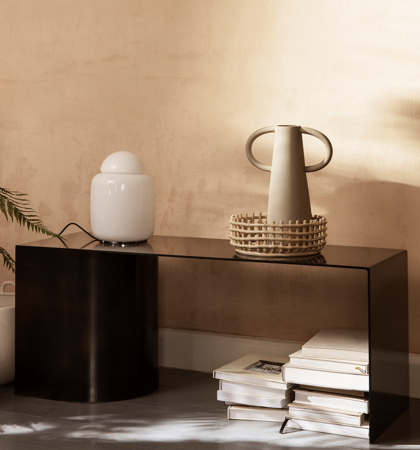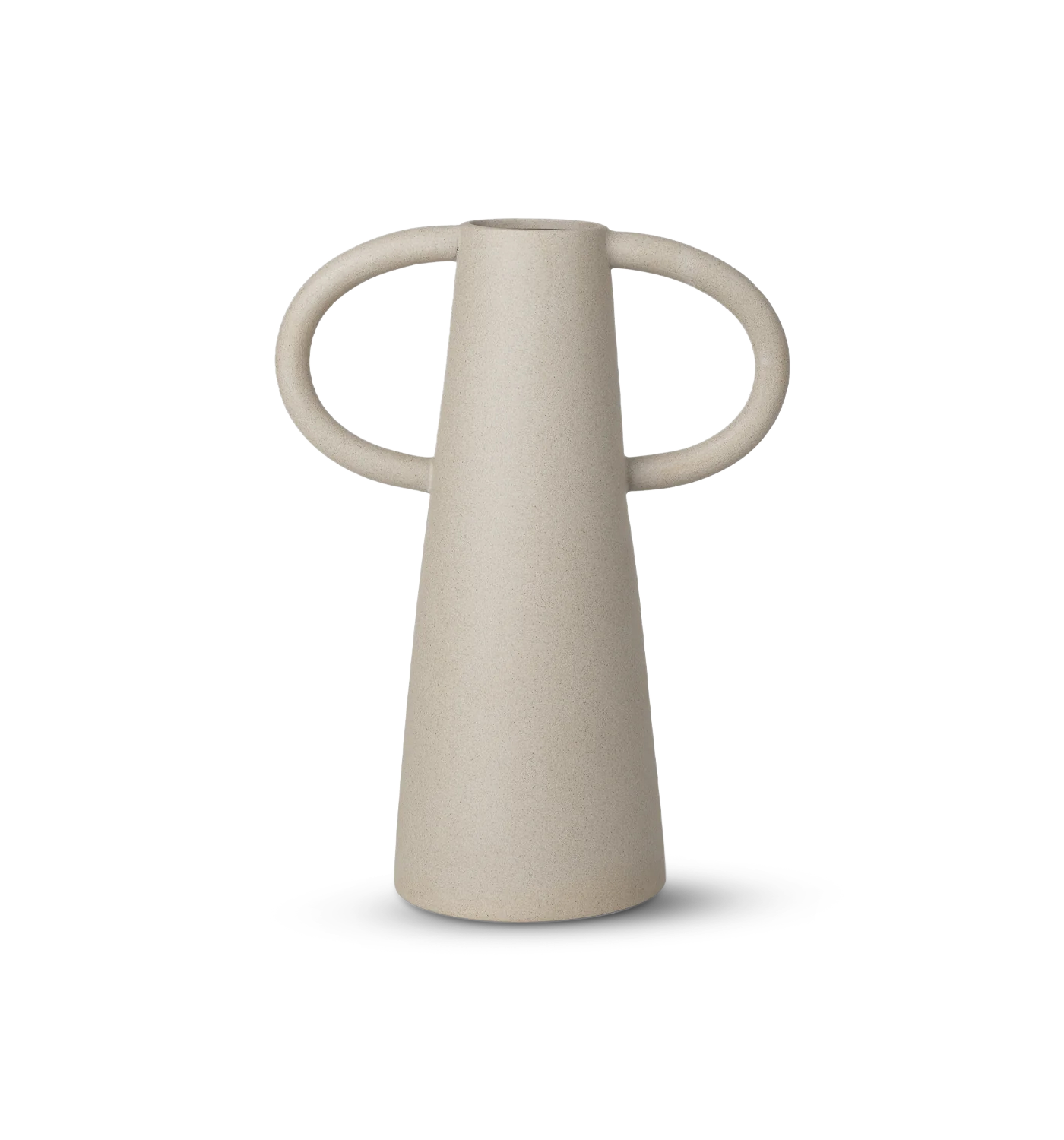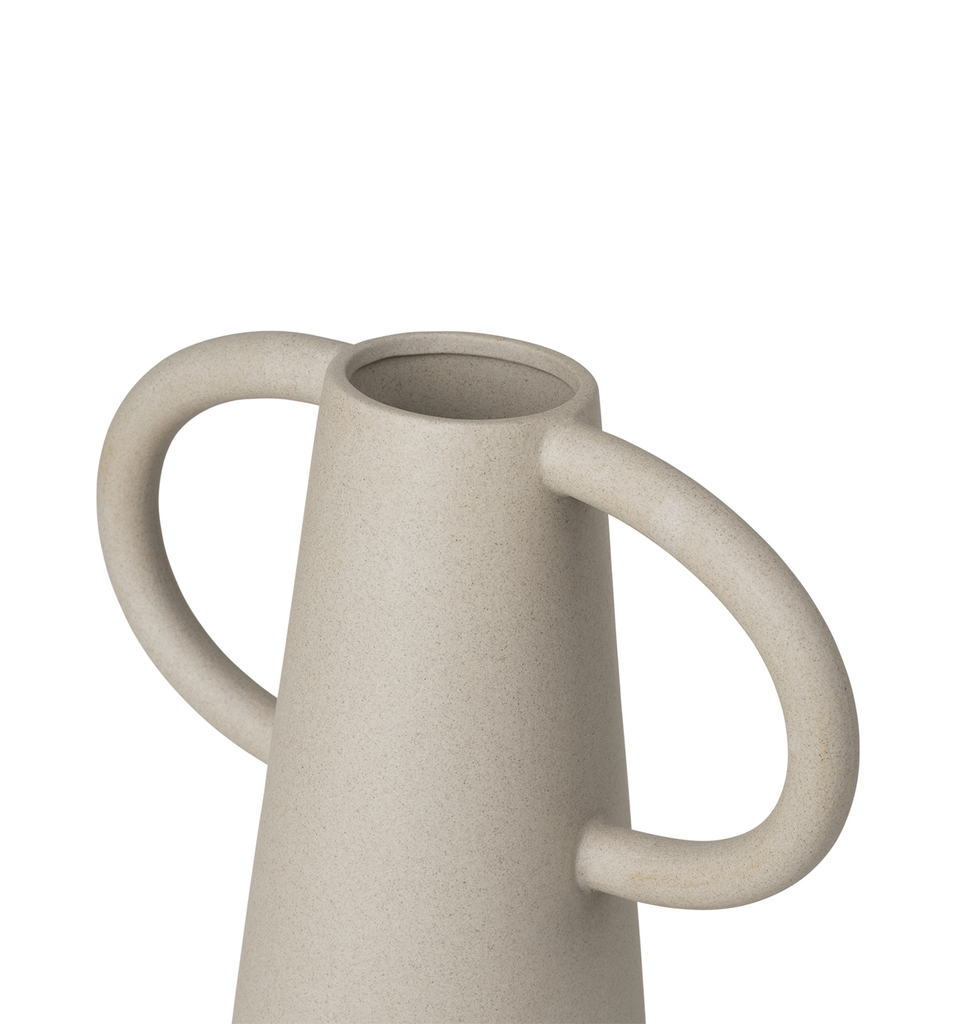 Past and present fuse together in the Anse Vase. Made from a special, rustic clay, the vase’s raw sand colour and rough texture are pleasantly contrasted by its clean, conical shape. A set of hand-formed handles recalling traditional pottery completes the unified expression.