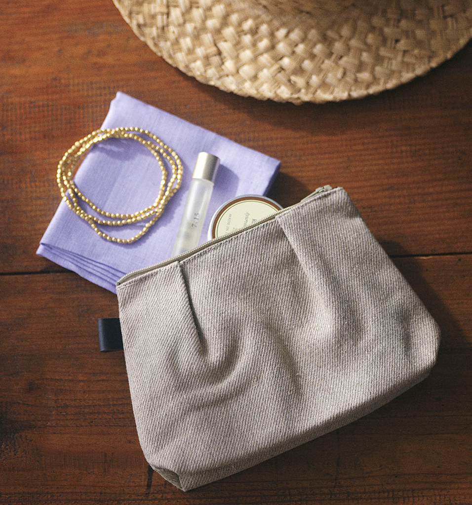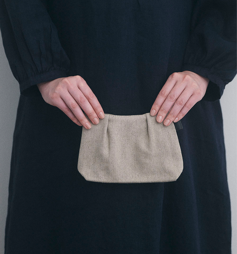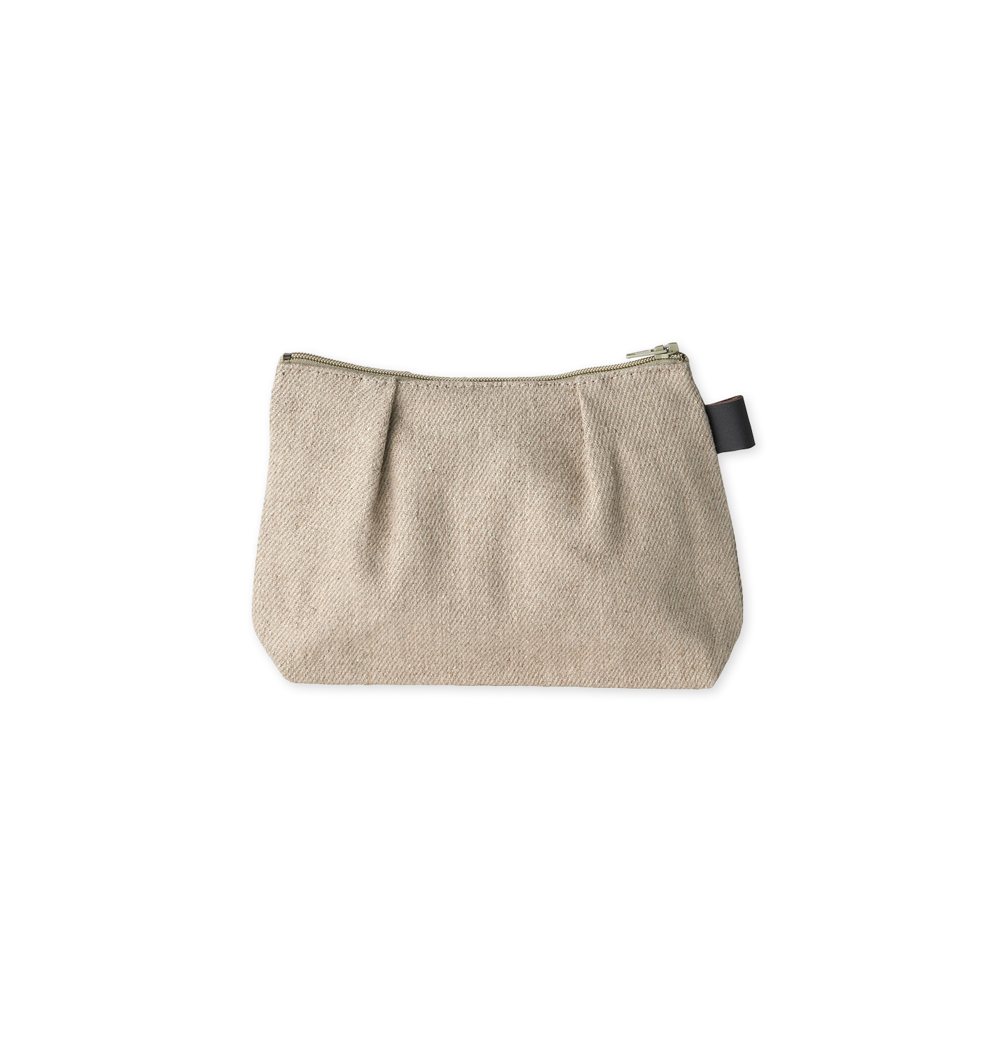 A handy pouch in a thicker linen with a leather side tab and zipper closure. Great for travel, a bag in your bag, or a sweet little clutch when you're keeping things light.