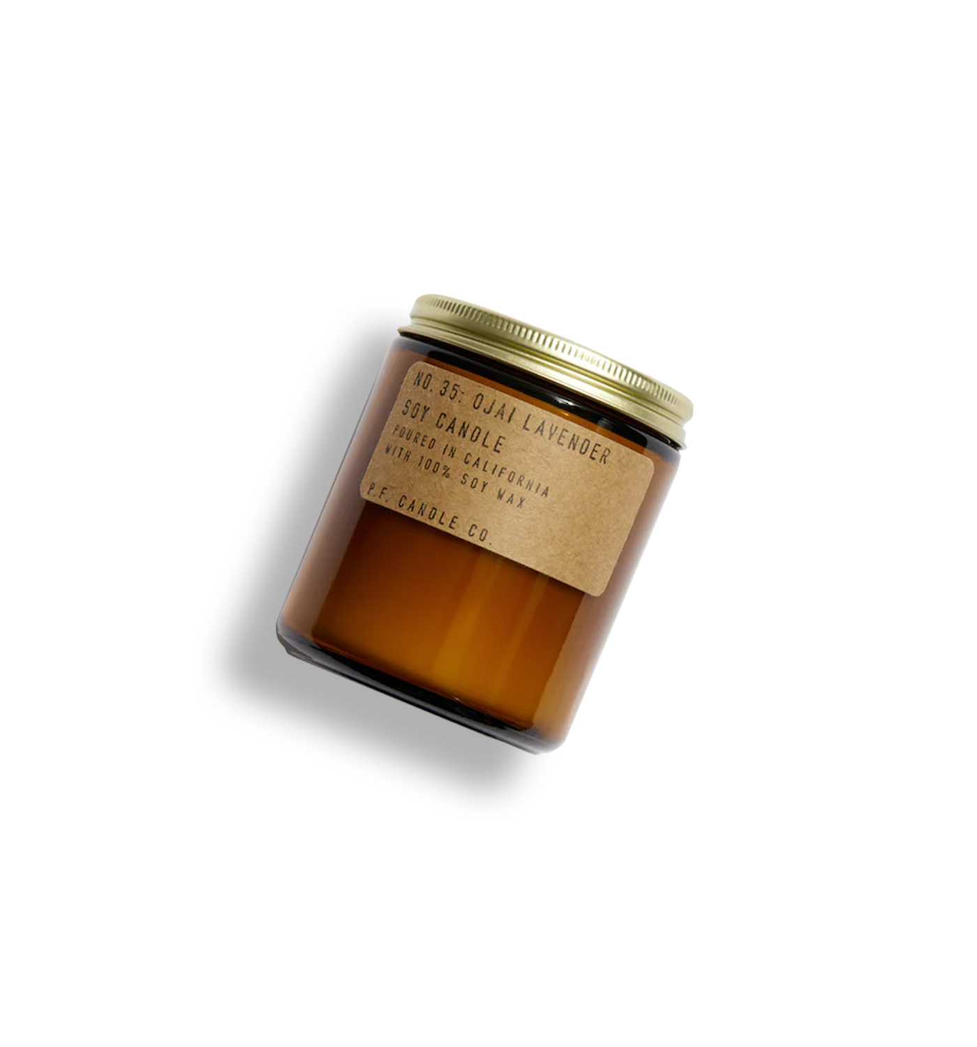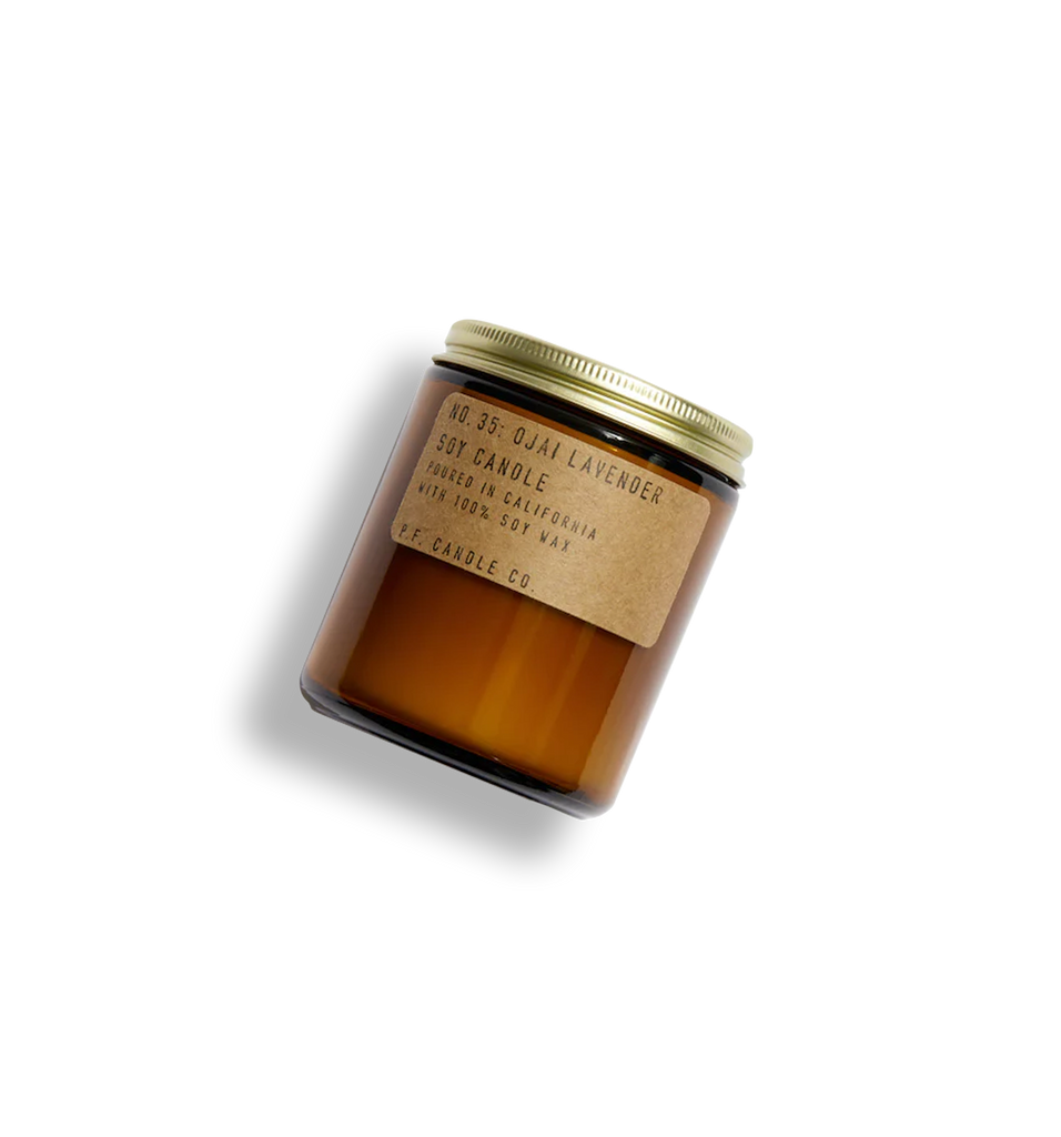 Domestically grown soy wax is scented with fine fragrance oils and hand-poured into apothecary-inspired amber jars before being topped with a brass lid.