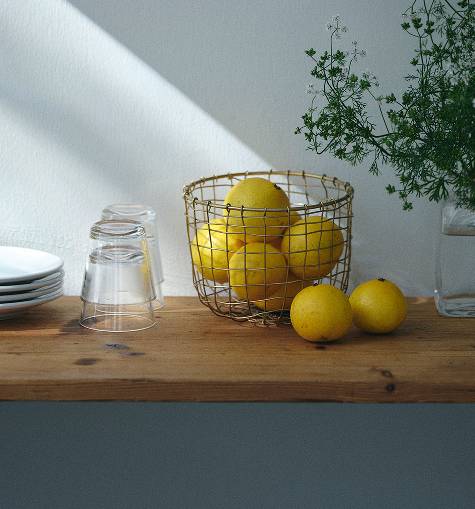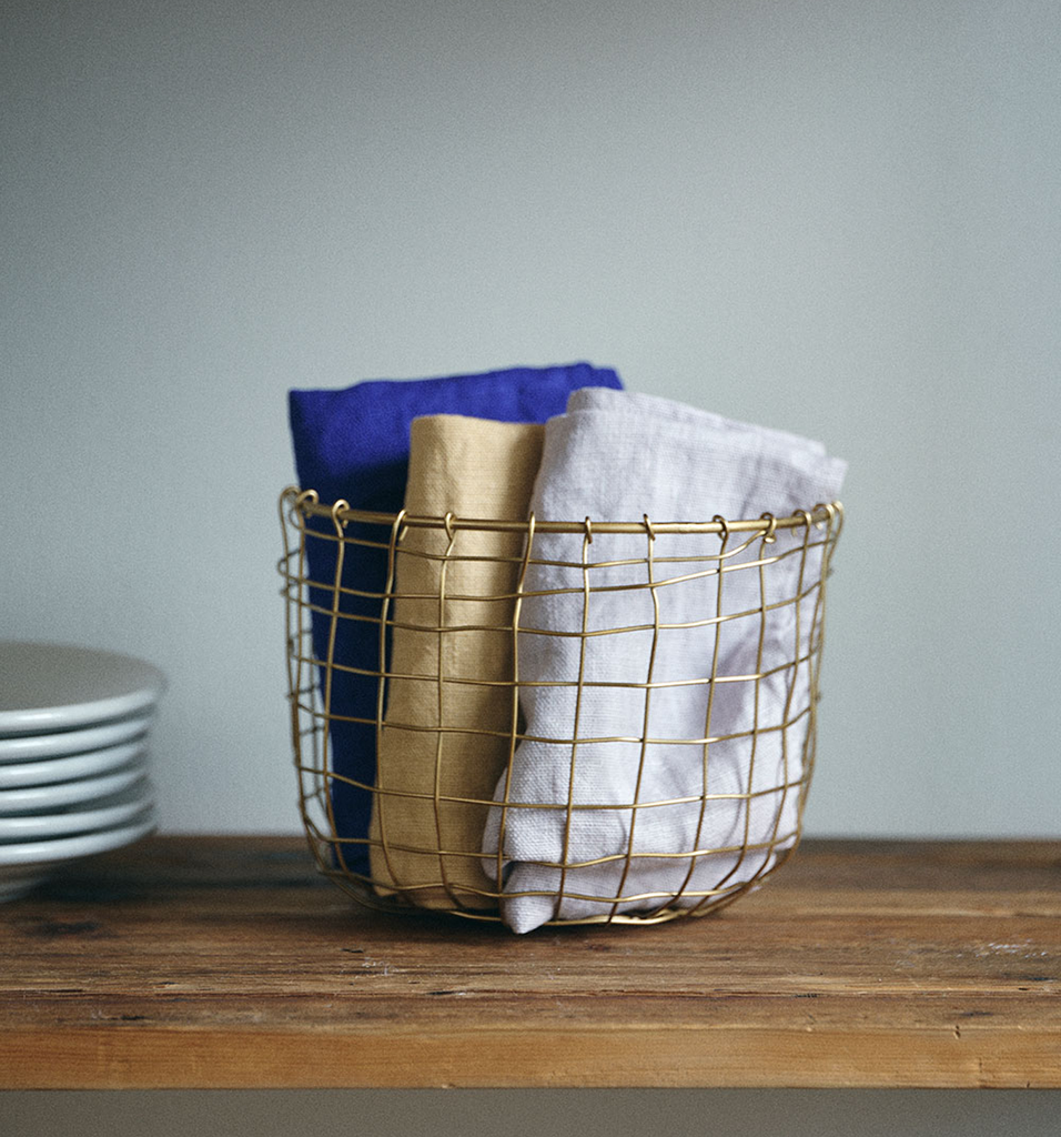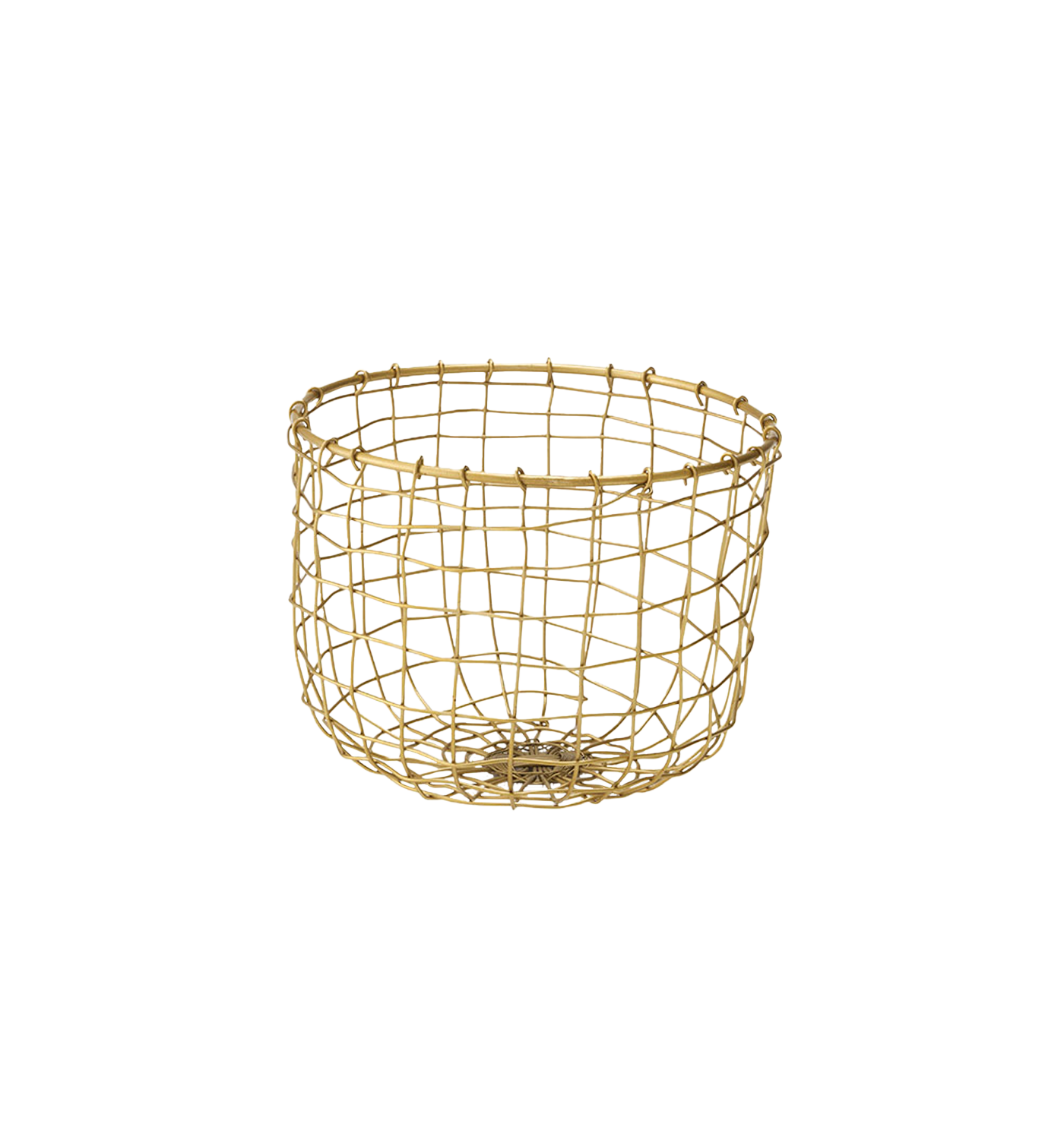 This handmade basket is made from gold-painted iron wire and features a deep, round shape. Ideal for keeping kitchen towels, or for visible storage of groceries and fruits.