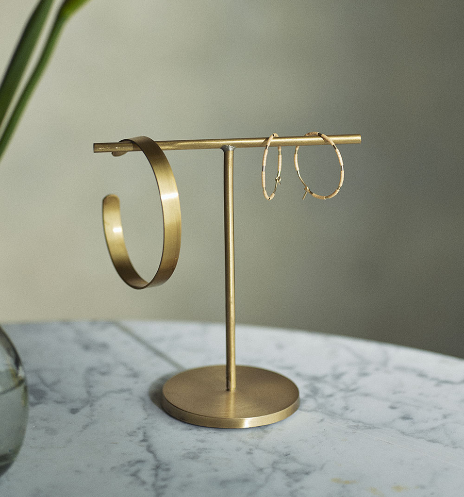 A handy stand in warm brass to keep earrings, bracelets and necklaces visible and ready to wear. Irregularities in finish may occur.