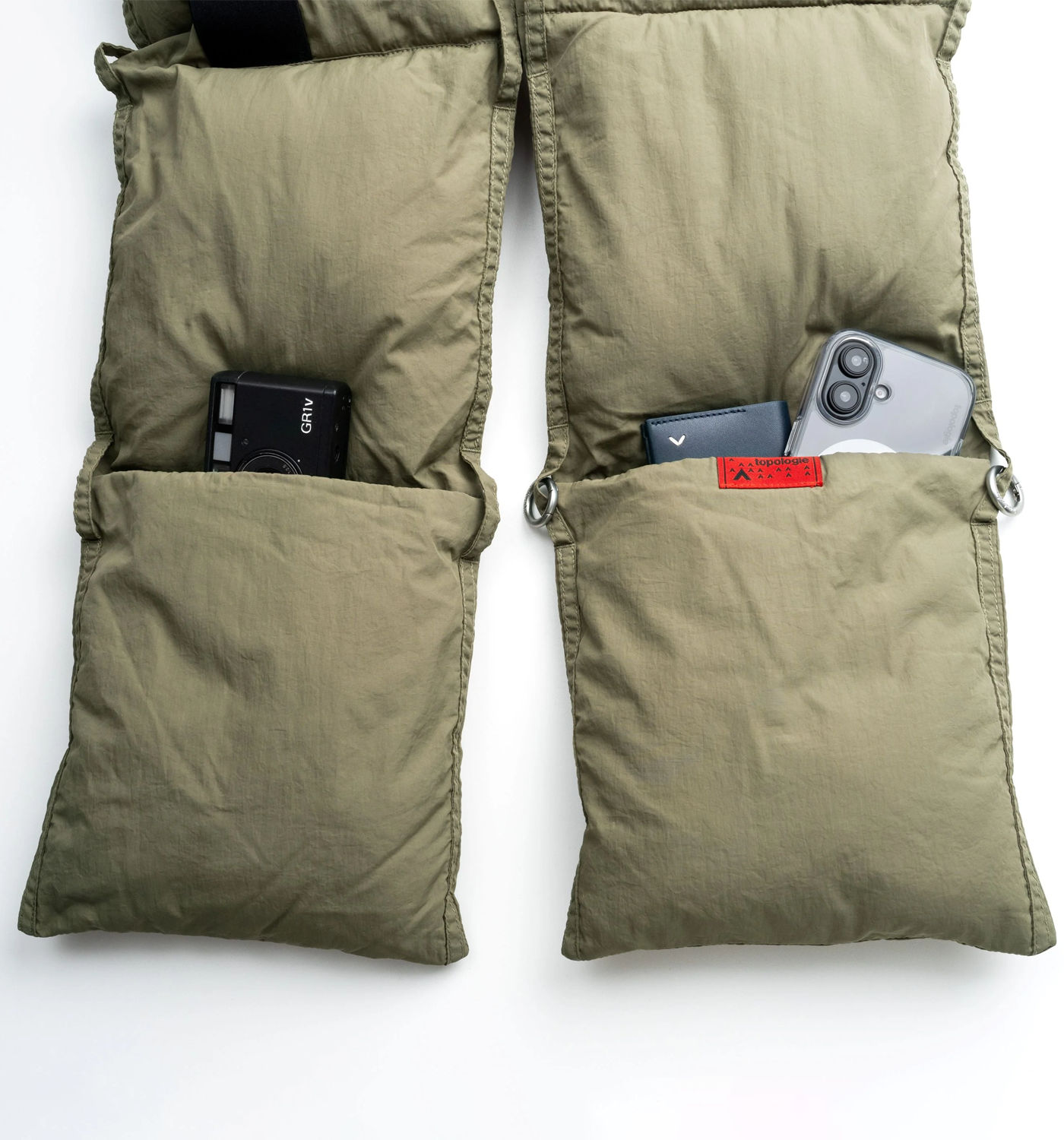 The design features two o-ring carabiners, two pockets, and loop webbing for practical wear.