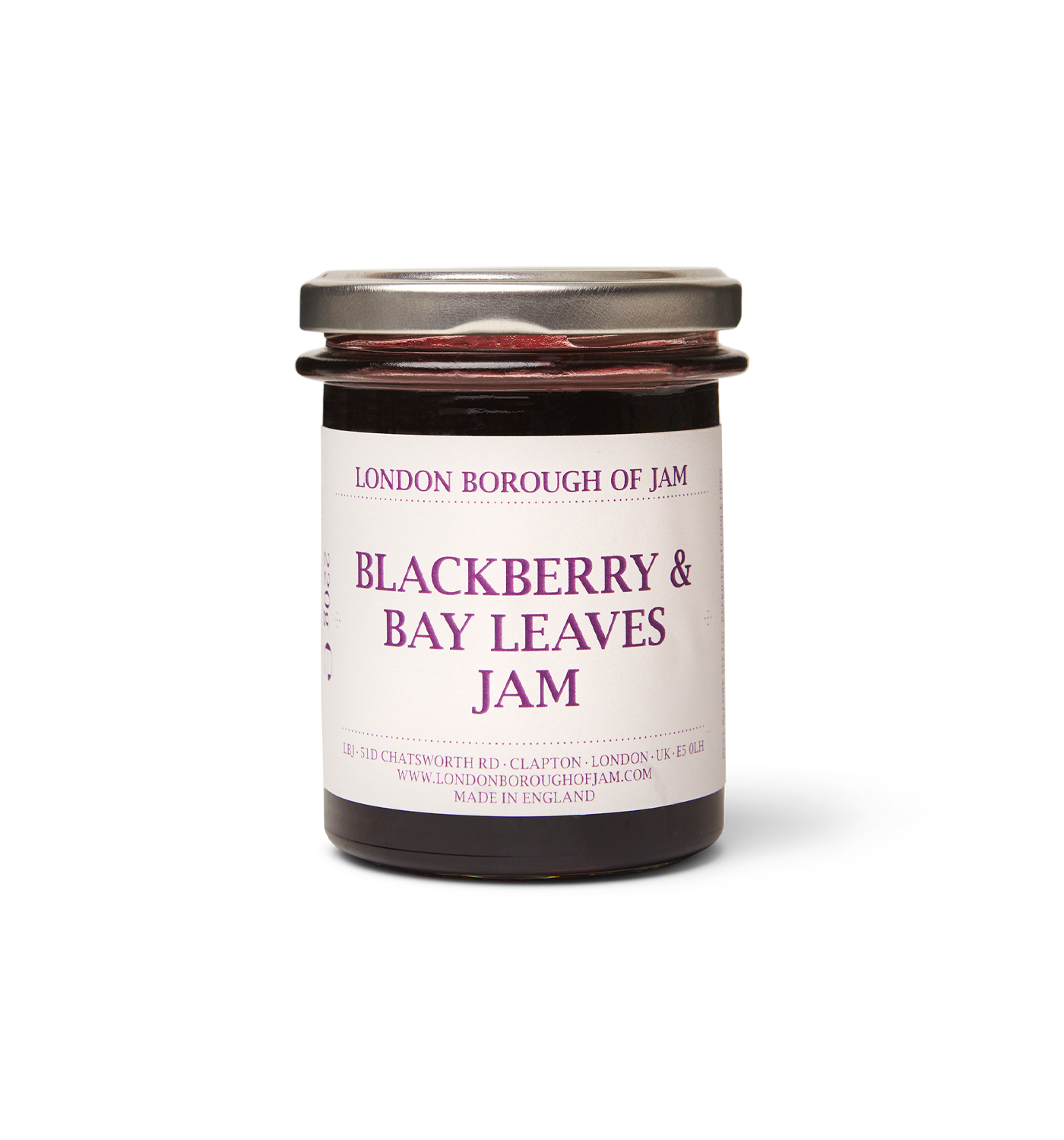 - Ingredients: Blackberries, unrefined caster sugar, lemon juice & ground bay leaf.