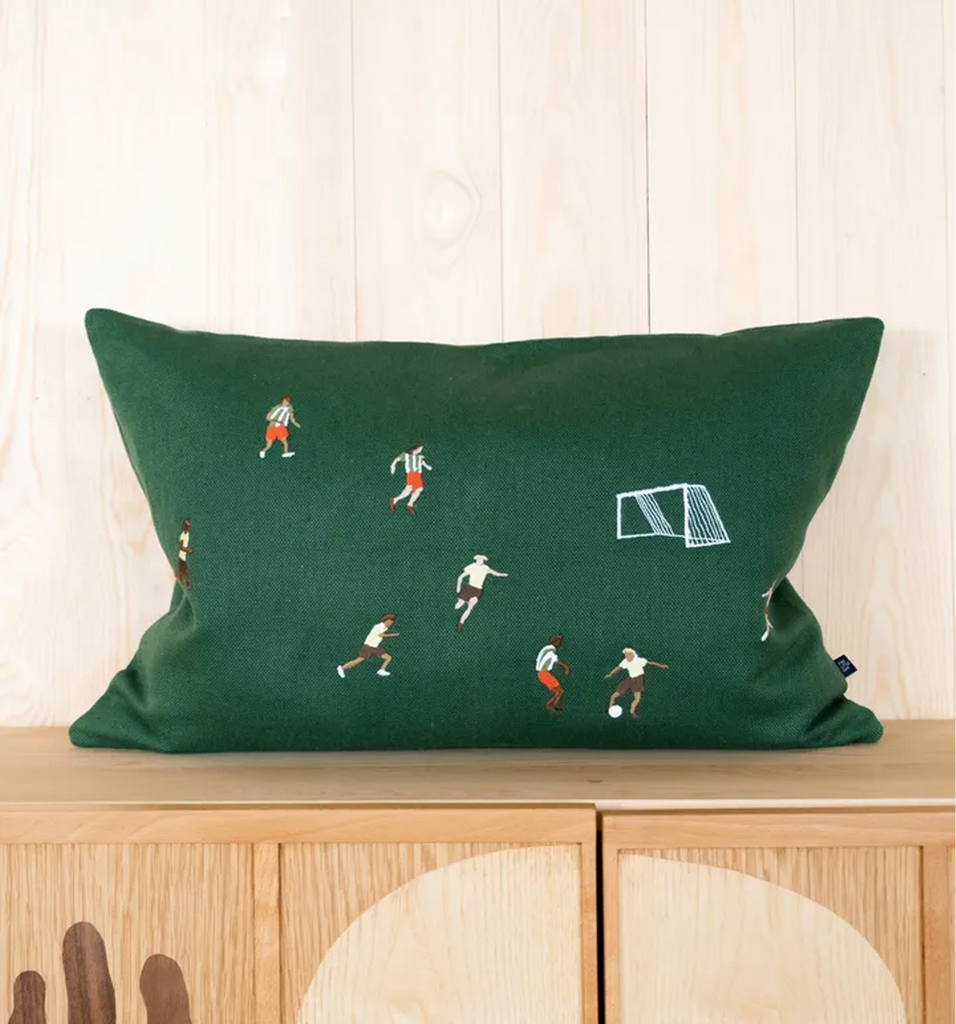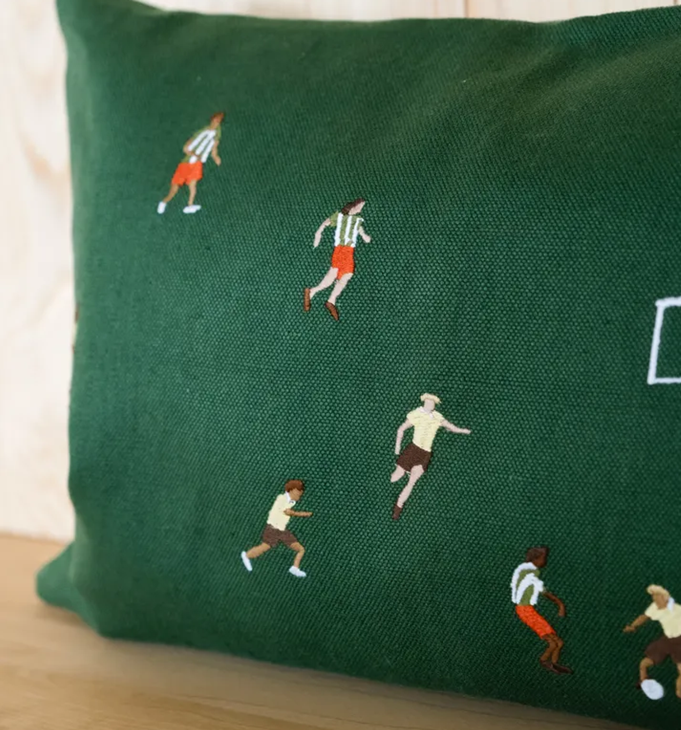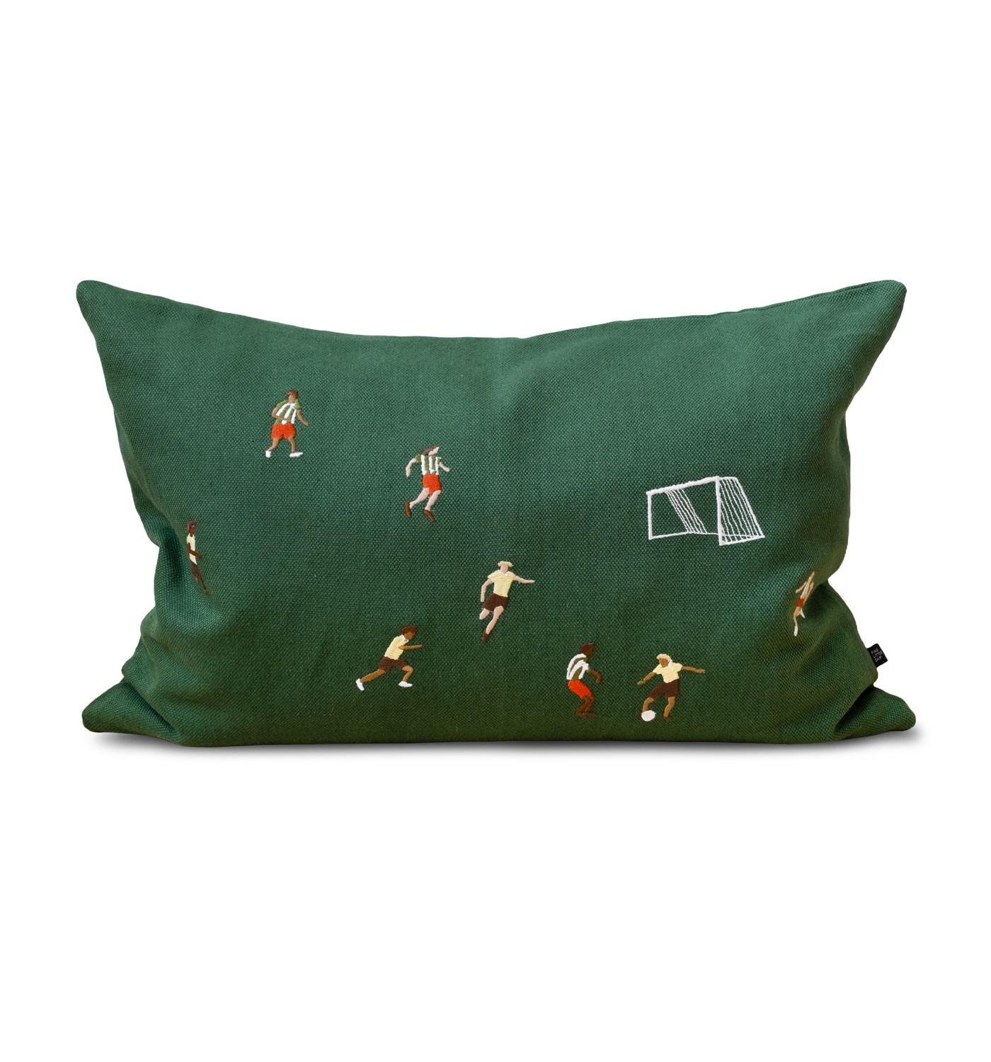 Together on the field, with a common goal. Embroidered cushion cover Soccer, original drawing with acrylic and crayon by Elisabeth Dunker.
