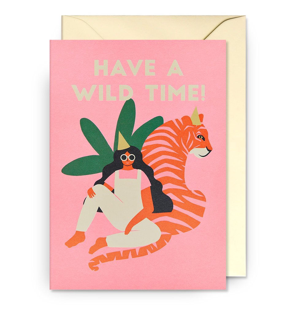 娜奧米·威爾金森 (Naomi Wilkinson) 創作的這張瘋狂狂野的賀卡明亮、大膽、兇猛。輕鬆老虎。