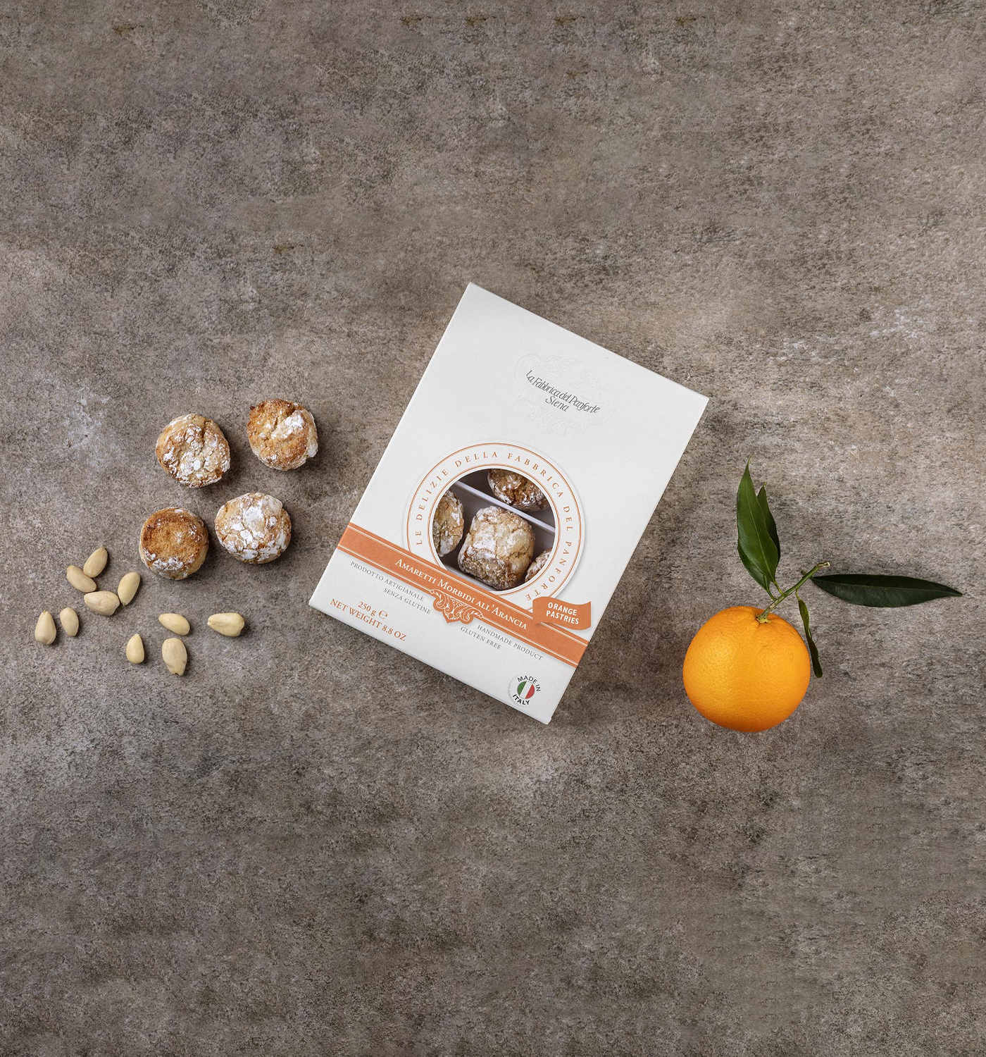 These deliciously soft and sweet pastries are the perfect after-dinner treat. Artisinally made in Tuscany, each individual amaretto is formed by hand before being gently browned in the oven and sprinkled with a dusting of icing sugar.
